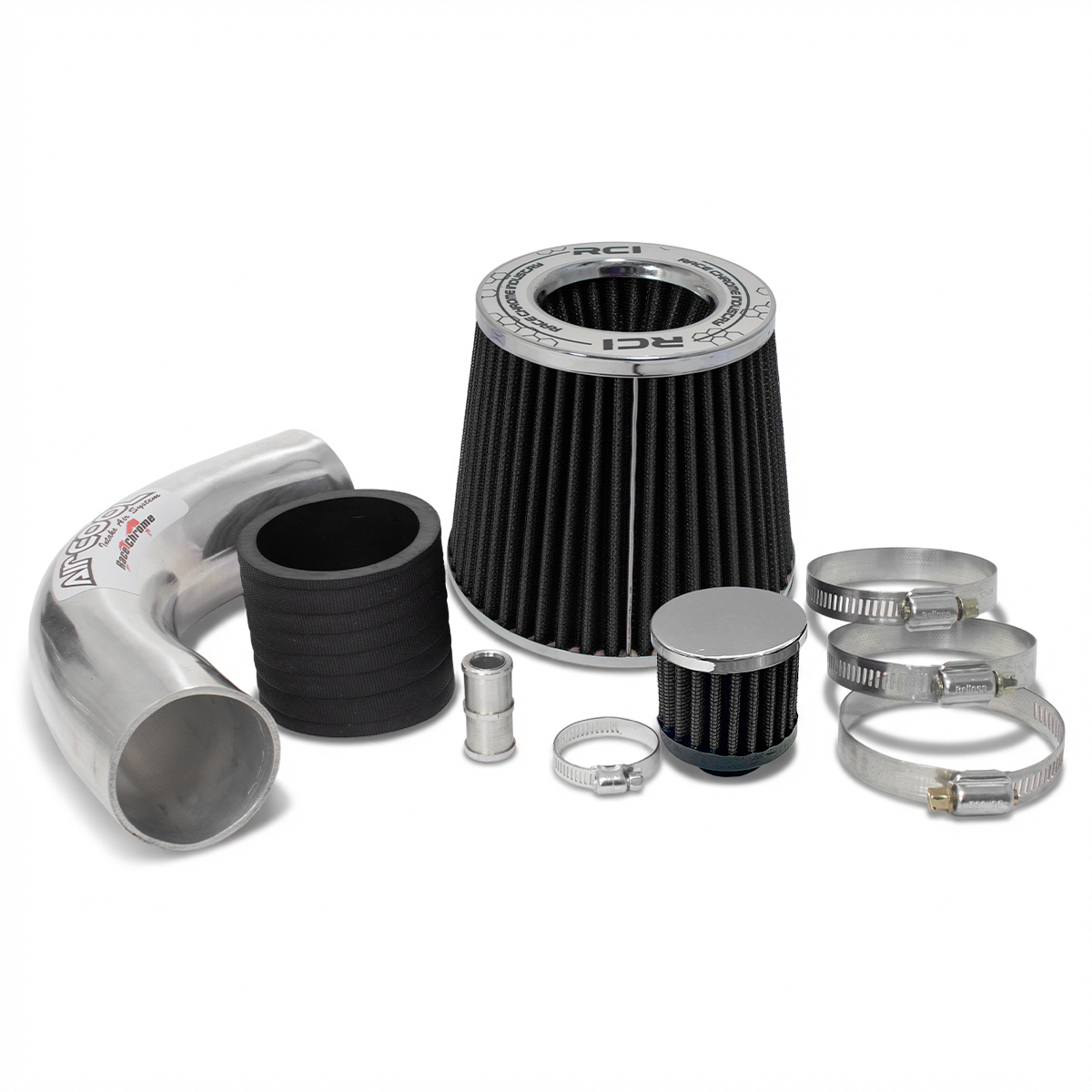 O kit Air Cool modelo RC371 acompanha duto para indução de ar frio com 2″1/2 de diâmetro, mangotes, abraçadeiras, e filtro de ar esportivo DUPLO FLUXO.