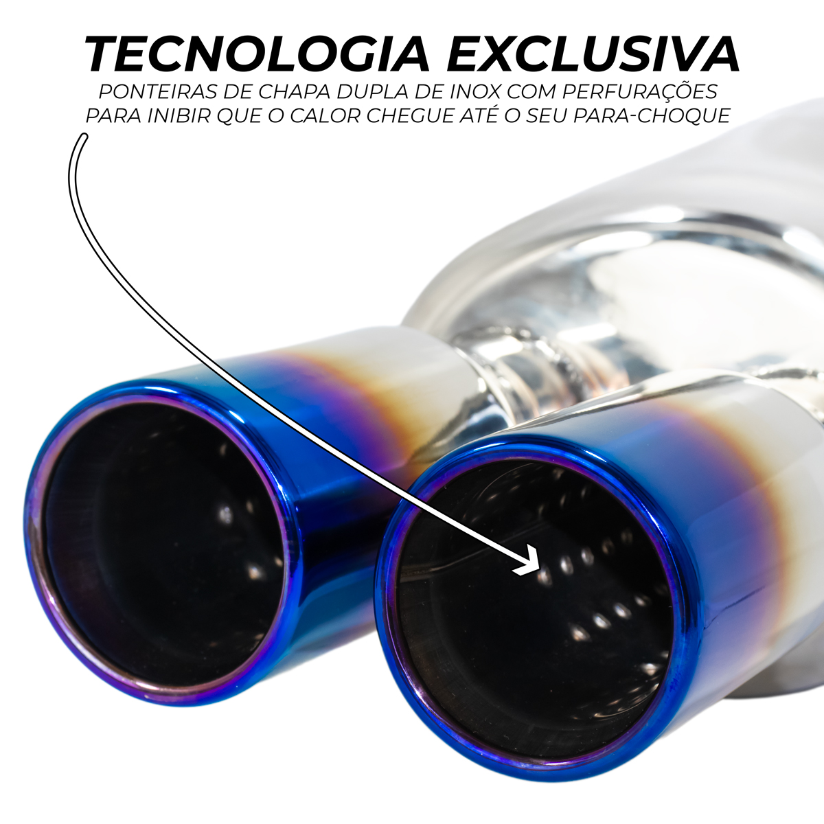 O encaixe de 2½″ garante compatibilidade com uma ampla variedade de sistemas de escapamento, facilitando a instalação e assegurando alinhamento correto das ponteiras após a montagem.